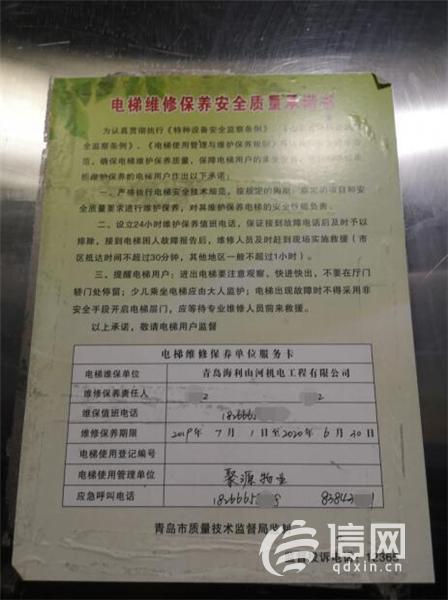 根据电梯内的维保公司电话,信网联系到了目前负责电梯维保工作的青岛海利山河机电工程有限公司。工作人员表示,目前对于电梯的使用年限并无特殊要求,但是一般情况下,电梯的工作年限都在13到15年,现在属于超长服役。“目前我们每15天都会对电梯进行一次维保,但因为电梯已经使用了接近20年了,零部件已经老化了,仅靠维保只能把故障率降低,没法彻底解决问题。”工作人员表示,6号楼的电梯因为之前管道破裂进了水,导致故障率偏高,所以业委会正在安排进行更换,其余楼座目前只计划更换1到4楼的部分。