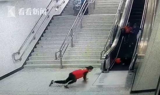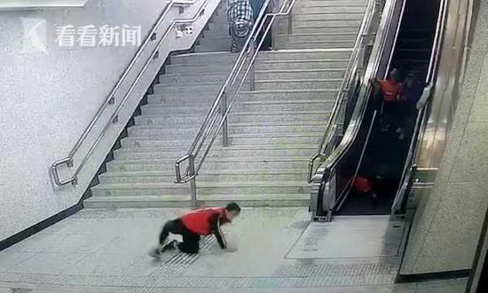 正在旁边帮其他乘客抬婴儿车的志愿者看到后,飞奔跑下来及时关停电梯。