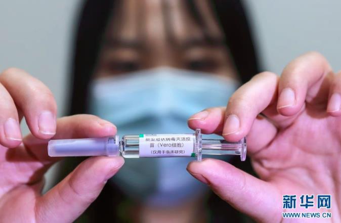 工作人员在国药集团中国生物新冠疫苗生产基地展示新型冠状病毒灭活疫苗样品(4月10日摄)。新华社记者张玉薇摄