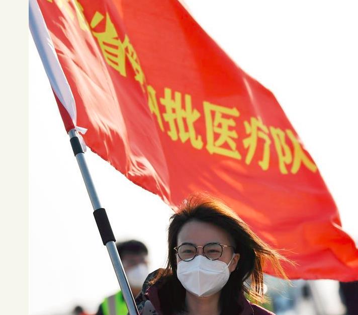 2月19日,陕西省第四批支援湖北医疗队队员在西安咸阳国际机场准备登机出发。新华社记者李一博摄