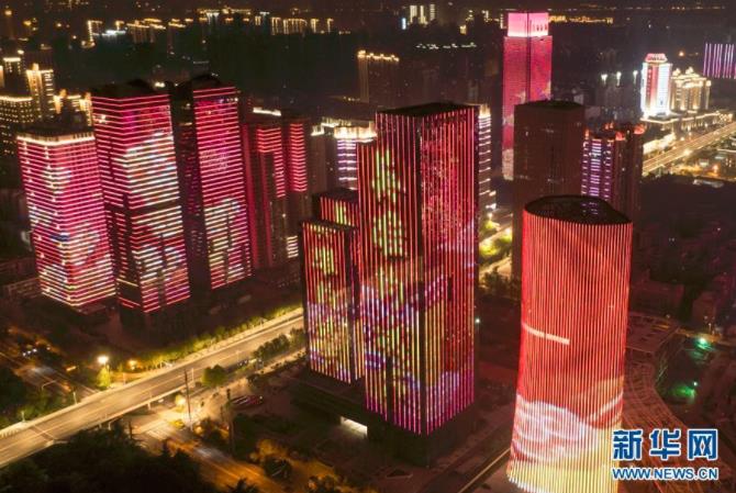 4月8日零时起,武汉市正式解除离汉离鄂通道管控措施,全市景观照明开启(无人机照片)。新华社记者程敏摄
