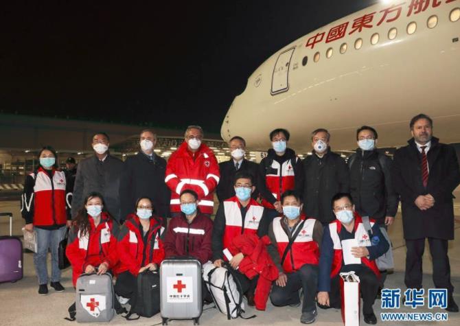 3月12日,在意大利首都罗马,意大利红十字会主席罗卡(后排右六)与中国抗疫医疗专家组一行9人合影。当天,由国家卫生健康委和中国红十字会共同组建的抗疫医疗专家组一行9人抵达罗马,并携带部分中方捐助的医疗物资。
