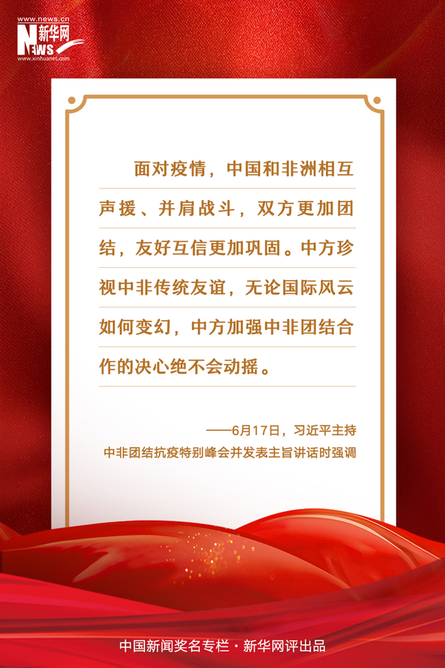 风雨并肩,携手战“疫”。面对新冠肺炎疫情,中国和非洲相互声援、并肩战斗。疫情发生后,50多位非洲领导人或致电或发表声明,向中国送来慰问和支援。一些非洲国家在自身条件困难的情况下,依然设法筹集物资捐赠给中国。中国向50多个非洲国家和非盟提供多批次物资援助;向非洲五个次区域及周边国家派遣抗疫医疗专家组;遍布非洲45个国家的中国医疗队积极行动,为当地民众提供医疗保障,并开展近400场抗疫培训,为当地数万名医护人员提供了指导……中国同非洲国家相互支持、守望相助、患难与共,经受住了严峻考验,为国际社会树立了团结抗疫的合作典范。这次中非领导人在团结抗疫形势下举行的特殊聚会,再次充分展现了中非友谊的牢固和中非关系的韧性,相信在共同抗疫的斗争中,中非友谊将进一步深化,也必将进一步推进中非携手抗击疫情,进一步提振全球早日战胜疫情的信心。