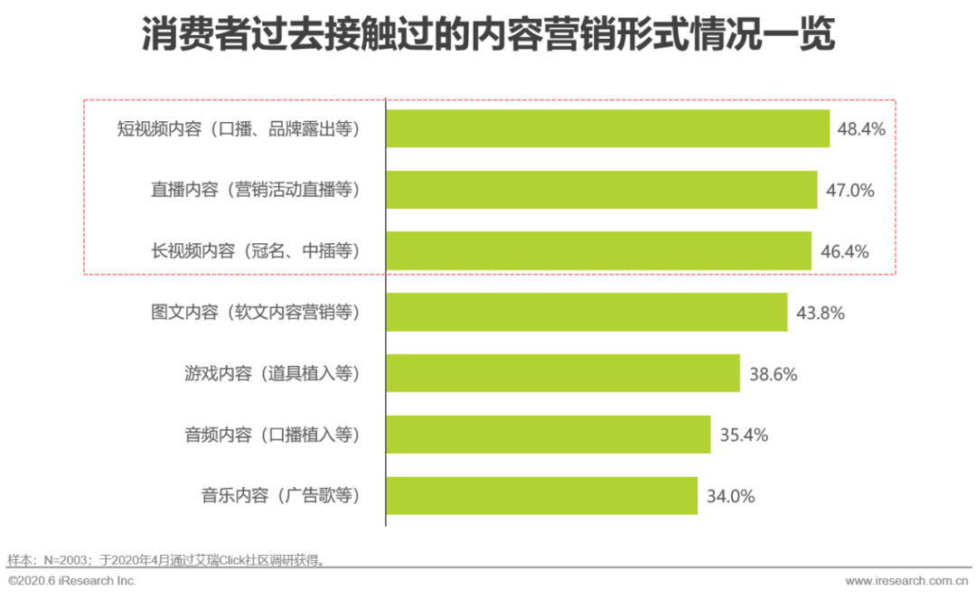 核心提示:根据艾瑞调研数据显示,消费者在接触过的内容营销形式中,短视频、直播、长视频占比包揽前三,均在45%以上。一方面,视频和直播承载更高维的信息密度,具有实时性和互动性特点,进而提升其真实性和趣味性;另一方面,随着淘宝直播、抖音、快手的快速崛起,以短视频和直播为代表的视频内容形式更容易实现用户流量的集聚,充分调动用户的碎片化时间。