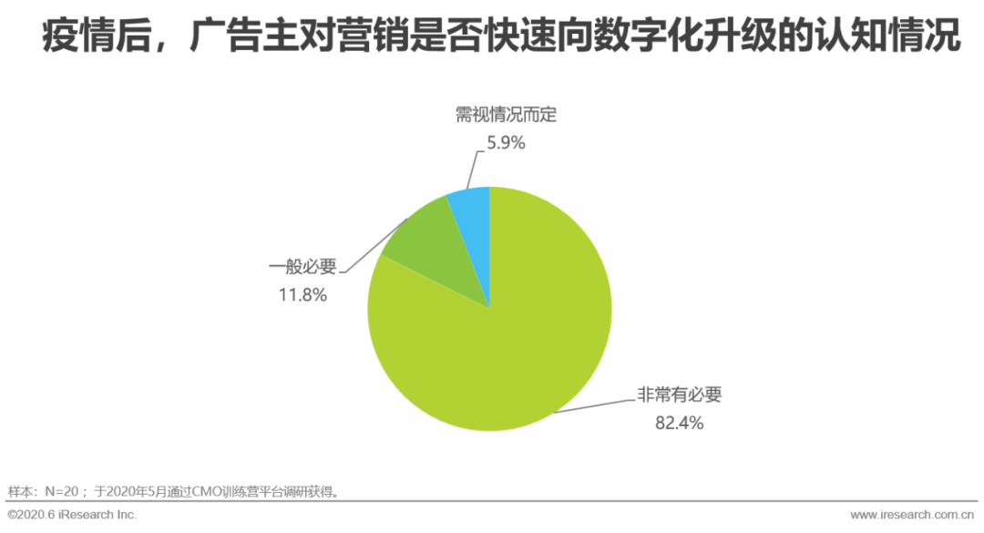 疫情加速中国企业业务线上化进程,随着此次新冠肺炎疫情的不断发酵,线下活动场景被限制,根据艾瑞调研显示,疫情期间居民外出次数一天外出一次及以上占比仅20.2%,倒逼各大企业加快数字化转型脚步,而企业直播服务作为企业对内沟通和对外营销的重要线上化端口,一方面,利用直播技术实现企业内部流程线上化,保证各部门之间流畅对接,避免企业长时间停摆。另一方面,利用线上渠道帮助企业吸引流量、宣传推广及打破线下的时空限制。因此在疫情之下企业直播服务需求井喷,行业客户量同比增长8-10倍。根据艾瑞广告主调研显示,疫情发生后,82.4%广告主认为营销数字化升级非常有必要,这足以说明广告主已经充分认识到了企业数字化转型的必要性。