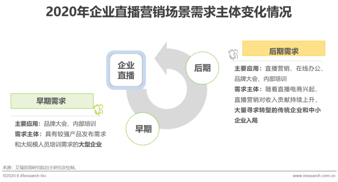 中国企业直播是指面向企业商务需求提供的、部署在服务提供商自己的服务器上的网络直播服务,是企业级SaaS服务的一种,因此企业直播需求由企业端决定。在发展早期,企业直播主要用于品牌大会、内部培训等,需求主体以具有较强产品发布需求和大规模人员培训需求的大型企业为主;在发展后期,尤其2018年后淘宝直播、抖音、快手快速崛起,直播带货、直播营销成为风口,李佳琦、薇娅等不断刷新成交记录,在这一背景下,企业直播需求主体边界拓宽,大量传统企业和中小企业入局,借助直播营销的东风实现收入的倍增。