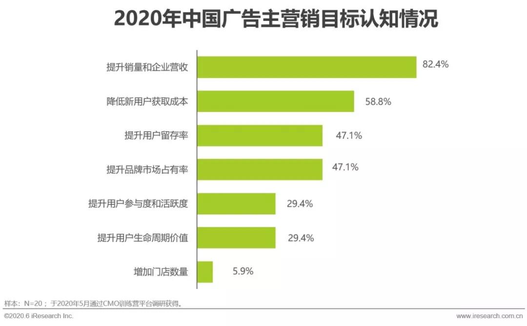 人口红利消退,大规模广告投放和推广铺设所花费的巨额成本,相比其所获流量和付费转化而言性价比不断下降,存量时代要求企业纵深发展和精耕细作。在此背景下,企业的营销需求重心由原来的流量拉新向以增加用户付费和留存转移,以较小成本获得更高的客户转化率。根据艾瑞广告主调研,82.4%的企业主未来一年的营销目标为提升销量和企业营收,58.8%企业主希望降低新用户获取成本,在广告主的营销目标上,既要保证销售增长,还希望能降低新用户的获客成本,这足以说明广告主对营销投入和回报的关注度,成本和效果的平衡是广告主当下发展阶段重要的需求。
