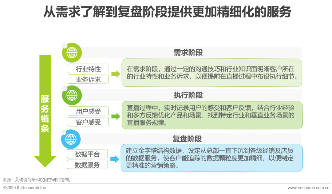 随着赛道企业竞争的加剧和基础技术的同质化,塑造精细化的服务成为企业直播服务商构建竞争壁垒的关键。从需求阶段看,了解客户所在的行业特性和业务场景诉求是关键,这需要企业直播服务商拥有一定的沟通技巧和对客户所在行业细致的了解,以便在正式直播过程中提前布设执行细节,从而保证直播效果。而在执行阶段,最重要的是记录直播观看用户的感受和企业客户的反馈,通过多方的反馈和感受来优化产品和场景,最终达到提升直播营销效果的目的。最后在复盘阶段,数据服务的提供是关键,可尝试建立金字塔数据结构,从总部一直下沉到各级经销商以及店员的精细数据服务,使客户能追踪的数据颗粒度更加精细,以便制定更精准的营销策略。