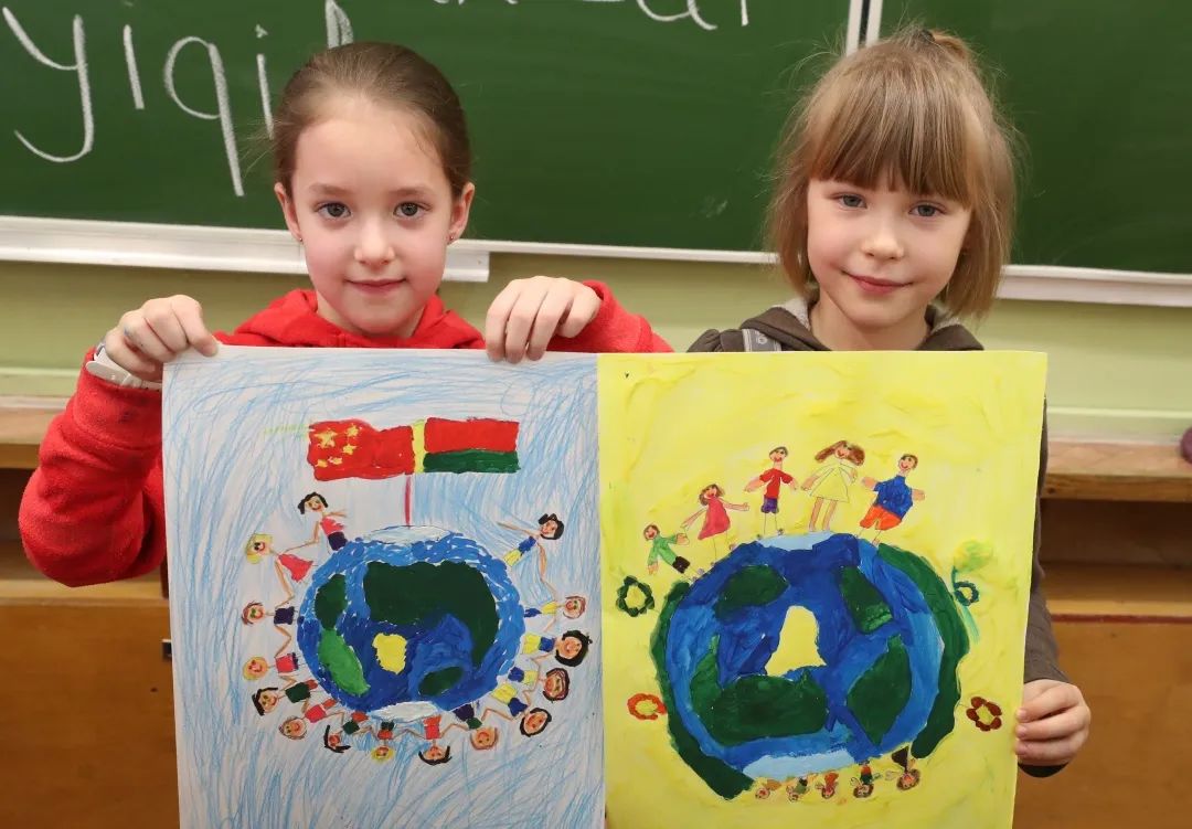 2月27日,在白俄罗斯首都明斯克,两名小学生展示自己支持中国抗击新冠肺炎疫情的绘画作品。新华社发(任科夫摄)