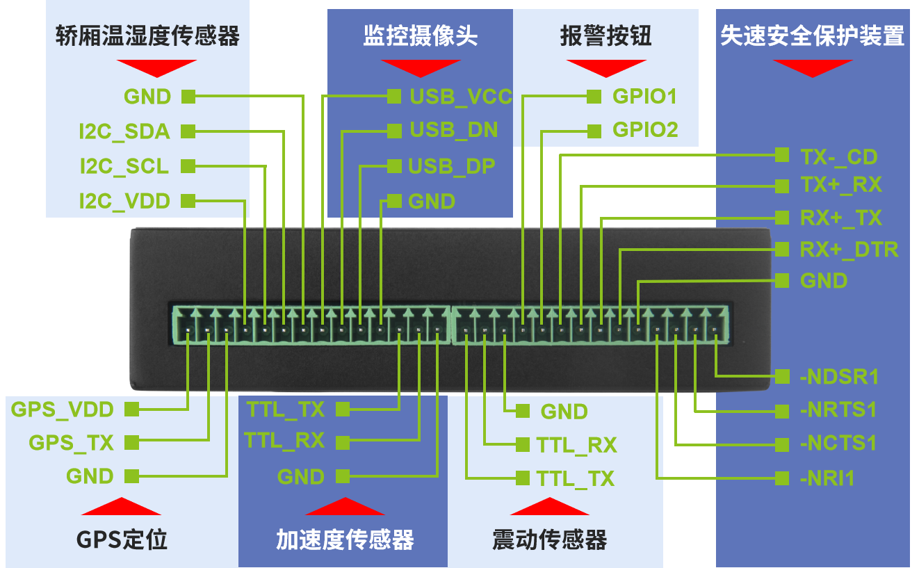 在整套电梯物联网管理方案中,将GPS定位传感器、轿厢温度传感器、加速度传感器、报警装置接入杰和R100;利用R100的边缘计算能力,对采集到的数据进行运算和整形,迅速识别并响应异常运行状态;最终通过无限局域网络或蜂窝数据网络上发至管理平台,完成电梯的物联网接入。