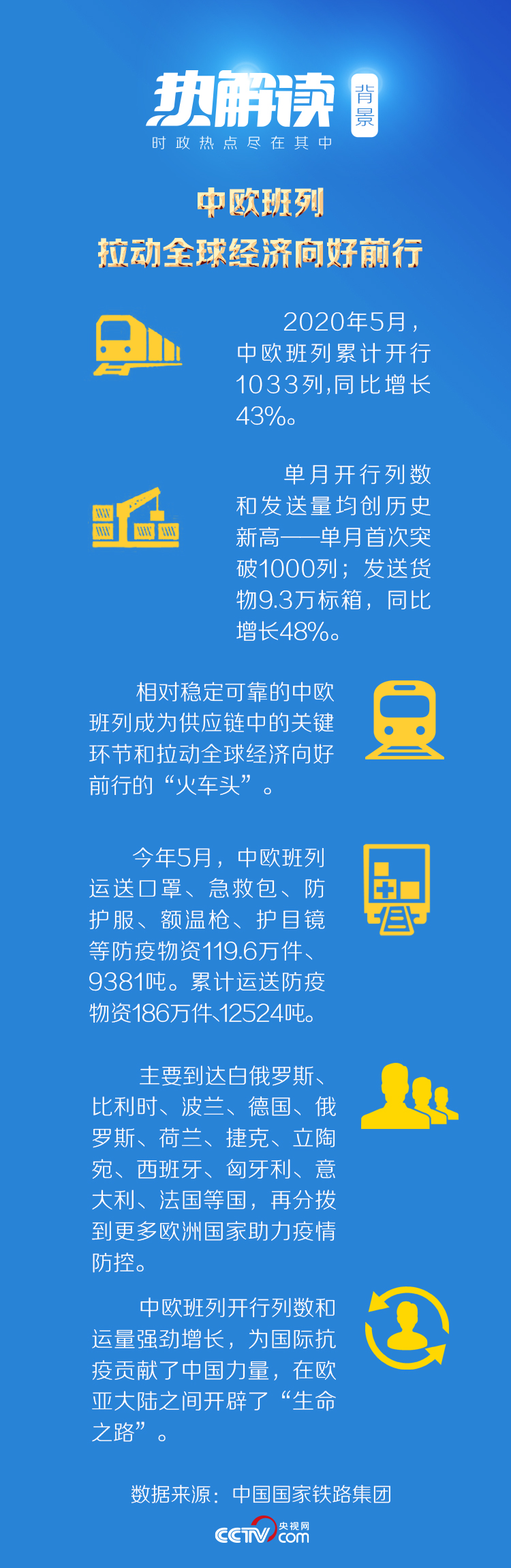 中欧班列逆“疫”驰骋,畅通国际抗疫“生命线”,满载着中国大爱的防疫物资驰援欧洲国家,给无数人民带去健康与希望,为全球抗疫增添了信心与动力。