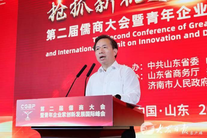 李干杰在致辞时说,2018年以来,我们成功举办了首届儒商大会、两届青年企业家创新发展国际峰会,今天这次大会必将再次汇聚起推动山东高质量发展的蓬勃力量。当前,山东坚定贯彻落实习近平总书记重要指示要求,统筹推进疫情防控和经济社会发展,着力打好三大攻坚战,实施八大发展战略,发起九大改革攻坚行动,培育十强现代优势产业集群,不断开拓机遇无限的“新高地”。我们正全力做好“六稳”“六保”工作,坚决守住疫情不反弹的底线,着力扩消费、强投资、稳外资外贸,加快投资的机遇前所未有。我们正全面深化改革扩大开放,全力服务和融入国家战略,推进新旧动能转换综合试验区、中国(山东)自由贸易试验区、中国-上合组织地方经贸合作示范区建设,共建平台的机遇前所未有。我们正全面优化营商环境,更加强调求真务实、更加强调依法行政、更加强调高效便捷,着力打造良好政治生态、社会生态、市场生态、自然生态,深度合作的机遇前所未有。山东机遇就在眼前、就在脚下。选择山东、投资山东,恰逢其时、正当其势。诚邀海内外企业家来山东考察洽谈,我们将提供一流服务、一流环境,让企业家朋友切实感受到“好客山东”的品质和热情。