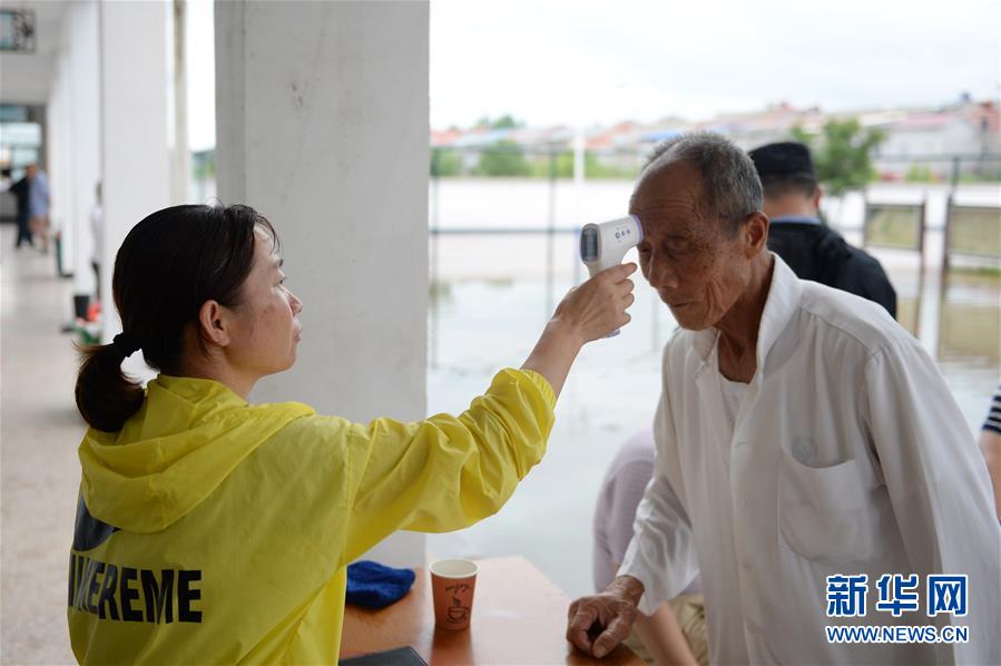 6月23日,在安徽省六安市裕安区一处临时安置点,工作人员给受灾群众测量体温。 新华社记者 黄博涵 摄