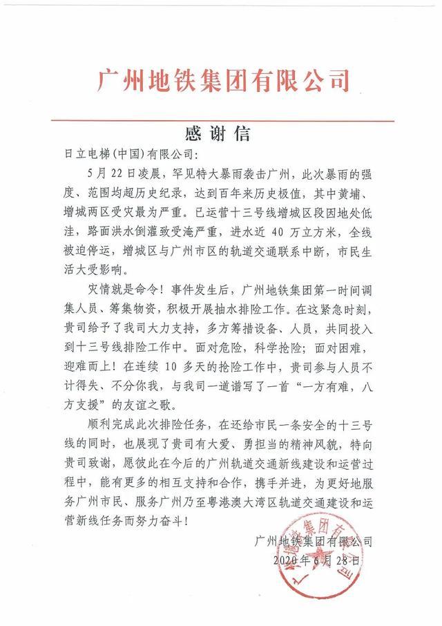 今年5月份,罕见特大暴雨袭击广州,导致地处低洼的十三号线增城区段严重受淹,全线停运,市民出行受到影响。日立电梯积极配合广州地铁,紧密投入抢险工作,为十三号线提供科学抢修、排险,收到了广州地铁集团的感谢信。
