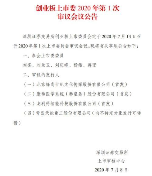 7月8日,深交所发布创业板上市委员会第一次审议会议公告,定于2020年7月13日审议锋尚文化、康泰医学、龙利得3家发行人首发申请以及天能重工发行可转债的申请。