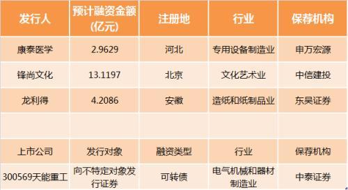 3家IPO受审企业中,康泰医学拟融资2.96亿元,注册地为河北,所属行业为专用设备制造业,保荐机构为申万宏源;锋尚文化你融资13.12亿元,注册地为北京,行业为文化艺术业,保荐机构为中信建投;龙利得拟融资4.21亿元,注册地为安徽,行业为造纸和纸制品业,保健机构为东吴证券。