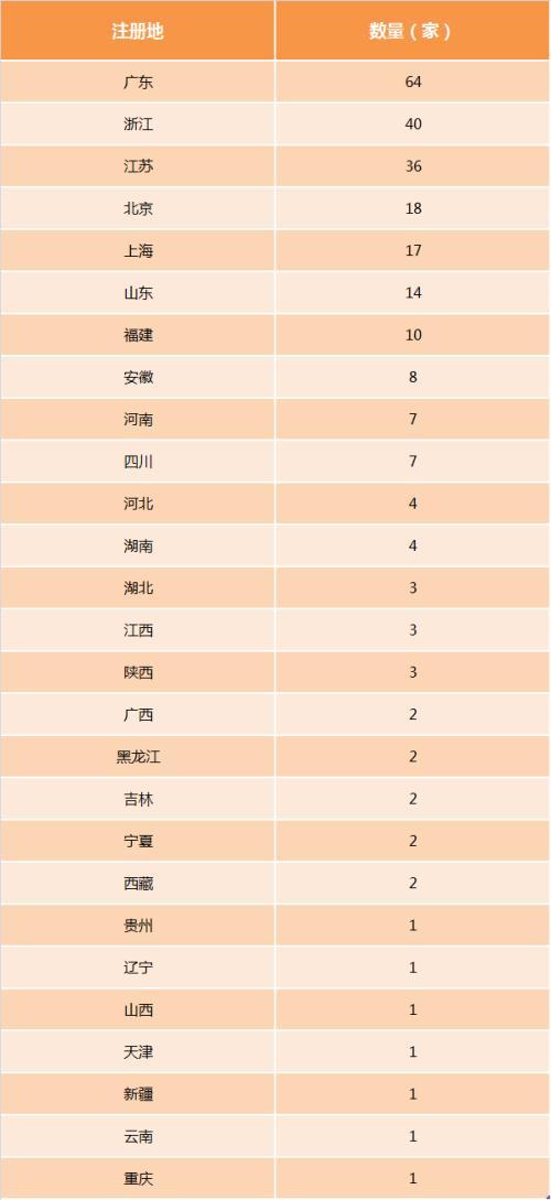 目前已受理的255家IPO企业中,在注册地方面,广东企业数量排名第一,目前共有64家企业IPO获得受理;其次是浙江,共有40家;第三位是江苏,共计36家。三个地区总计共有140家企业,约占获受理企业总量的55%。