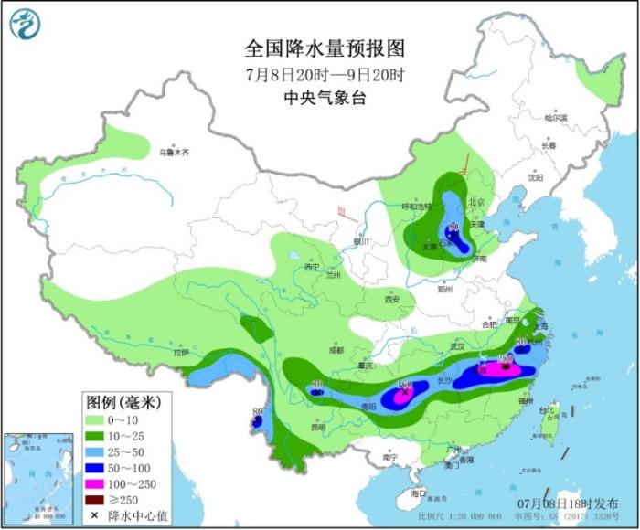 据预计,7月8日20时至9日20时,江西中北部、福建北部、浙江中南部、上海、湖南中部、贵州中南部、广西北部、云南西部和东北部、四川南部以及华北中西部等地有大到暴雨。