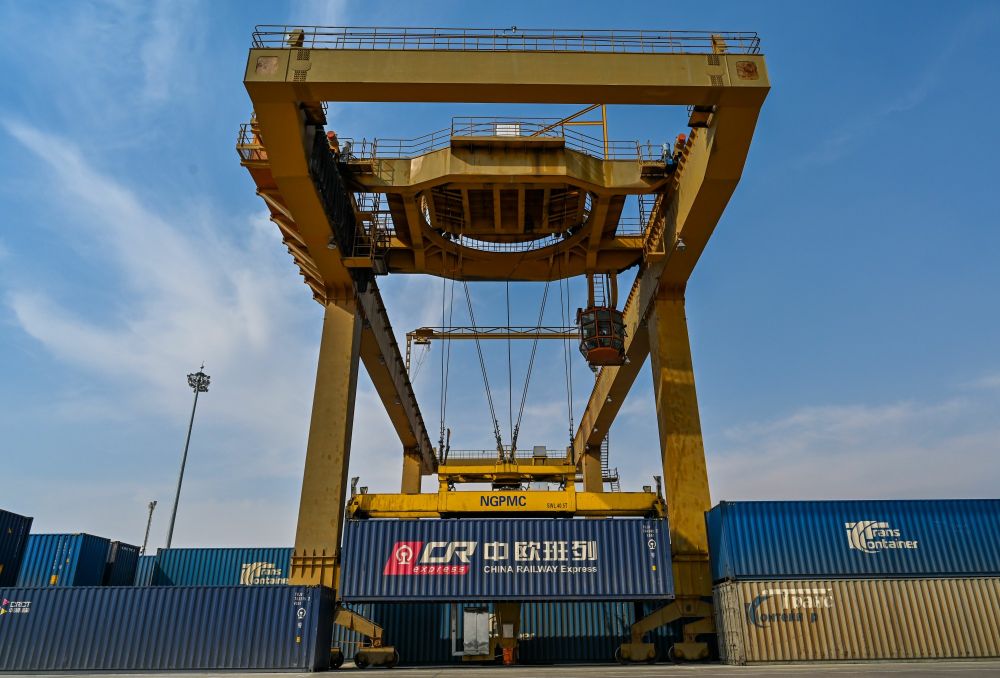 2020年4月13日,在满洲里铁路车站集装箱场,吊车装运集装箱。中俄最大陆路口岸满洲里充分发挥对俄运输大通道的桥梁纽带作用,积极服务中欧班列运输,助力中欧班列高质量发展。新华社记者于嘉摄
