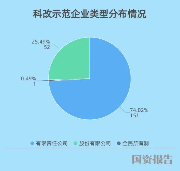 从企业类型分布来看,“科改示范企业”绝大部分为有限责任公司(151户,74.0%);股份有限公司为52户,占比25.5%;1家为全民所有制企业,见下图。