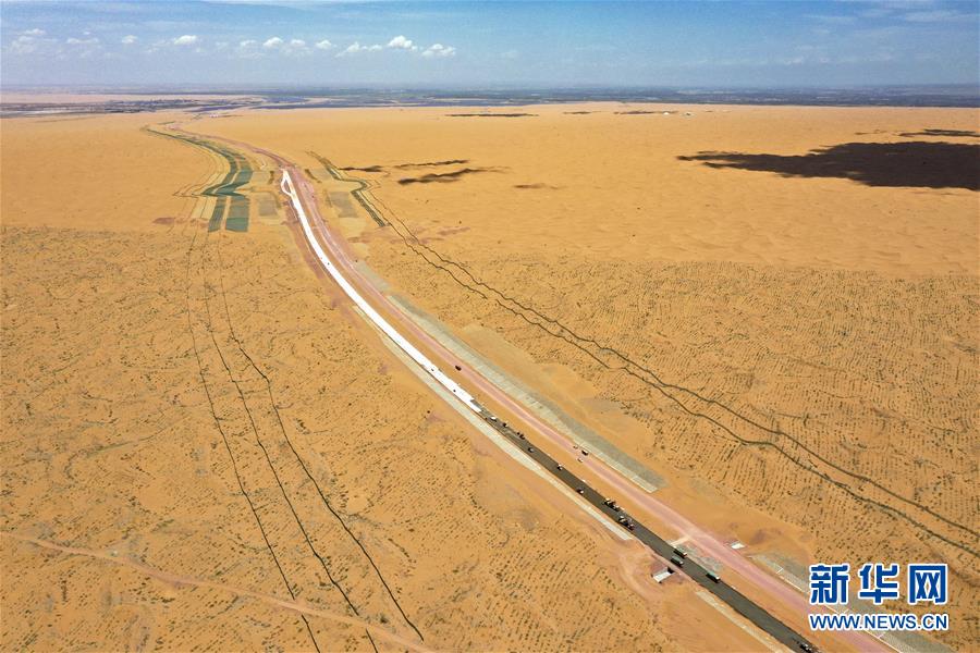 乌玛高速青铜峡至中卫段穿越腾格里沙漠的18公里路段,与中国首条沙漠铁路——包兰铁路交汇(7月10日摄,无人机照片)。盛夏时节,位于宁夏境内的乌玛(内蒙古乌海市至青海玛沁县)高速青铜峡至中卫段正在抓紧施工建设。该路段主线全长122.9公里,其中穿越腾格里沙漠腹地的18公里公路是宁夏建设的首条沙漠高速公路,预计2021年建成通车。新华社记者冯开华摄