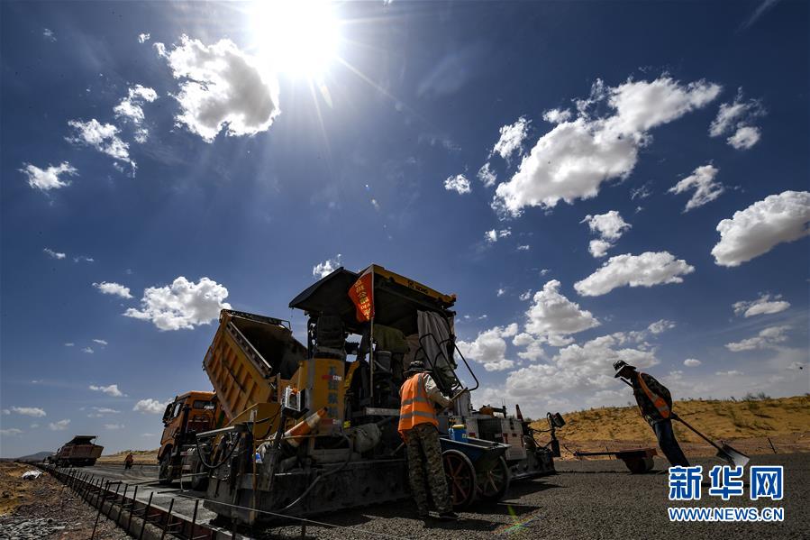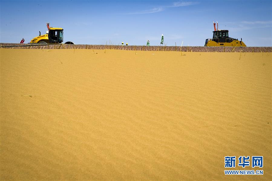 7月10日,工人在位于宁夏境内的乌玛高速青铜峡至中卫段A10标段施工。盛夏时节,位于宁夏境内的乌玛(内蒙古乌海市至青海玛沁县)高速青铜峡至中卫段正在抓紧施工建设。该路段主线全长122.9公里,其中穿越腾格里沙漠腹地的18公里公路是宁夏建设的首条沙漠高速公路,预计2021年建成通车。新华社记者冯开华摄