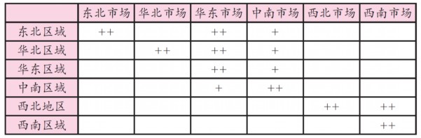 依据上述分析,列出各区域钢铁企业的核心及重点区域市场矩阵(“++”表示核心区域市场,“+”表示重点区域市场),如表1所示。