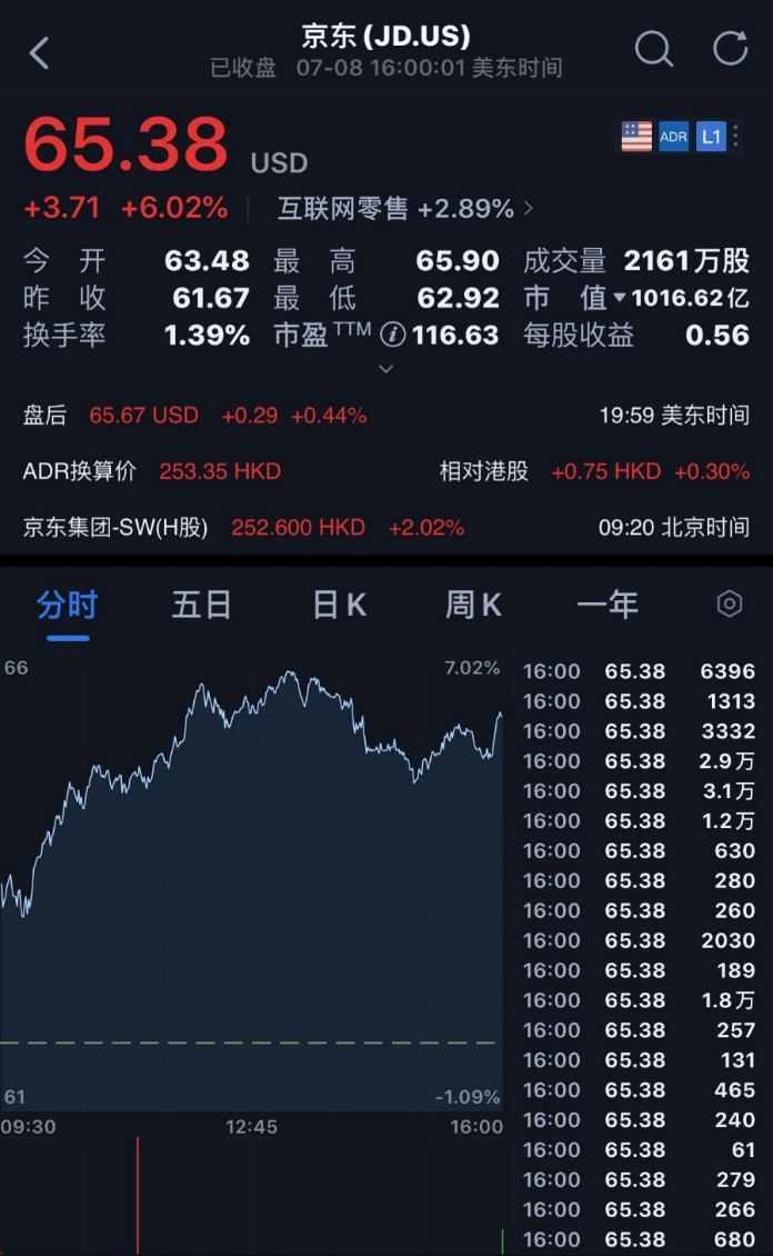 京东周三美股盘中大涨,涨幅一度扩大至7.65%,股价创历史新高触及65.9美元。市值也首次站上千亿美元,成为继阿里巴巴、腾讯、美团、拼多多之后,第五家进入“千亿美元俱乐部”的互联网公司。