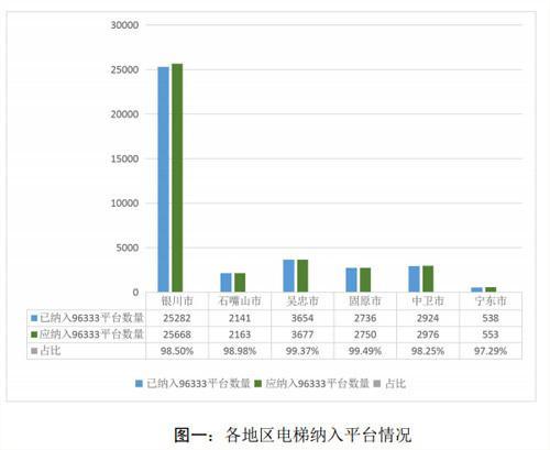 全区加入96333平台的电梯37275台,占应加入总数的98.65%,其中银川市加入96333平台的电梯数量最多,共有25282台,占全区的67.83%;固原市电梯加入96333平台的比例最高,达用的99.5%。
