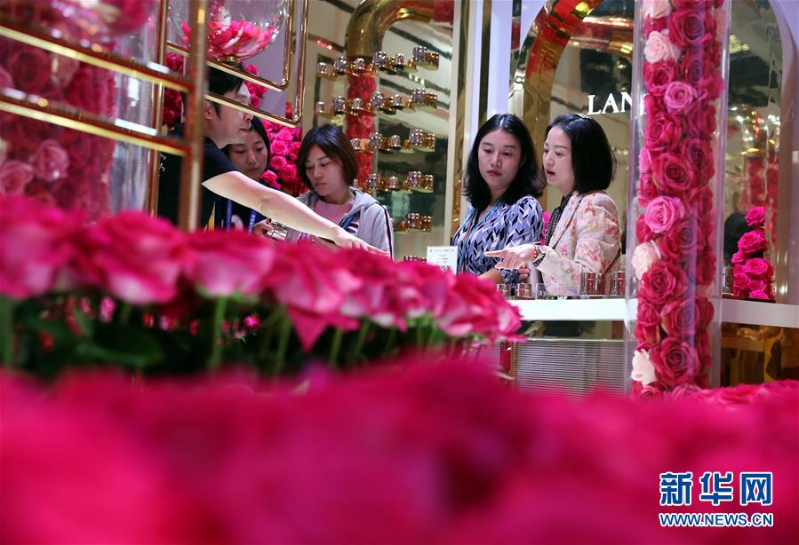 参观者在第二届进博会品质生活展区一家化妆品展台参观(2019年11月6日摄)。新华社记者刘颖摄