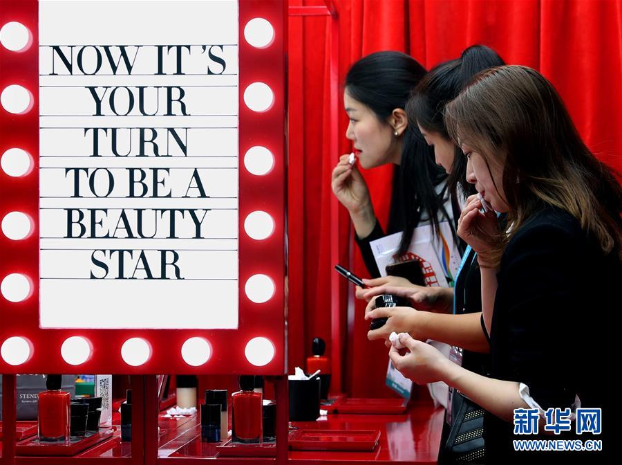 在第二届进博会品质生活展区,观众在欧莱雅旗下品牌彩妆展台试用口红(2019年11月6日摄)新华社记者刘颖摄