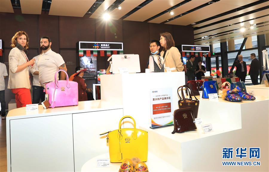 2020年5月8日,虹桥品汇国别文化节云游意大利主题展在上海虹桥进口商品展示交易中心举行,参观者从展览上一个意大利皮具展示台前走过。新华社记者方喆摄