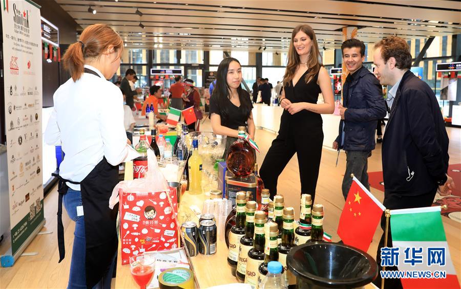 2020年5月8日,虹桥品汇国别文化节云游意大利主题展在上海虹桥进口商品展示交易中心举行,嘉宾在一家意大利酒类企业的展台前驻足观看。新华社记者方喆摄
