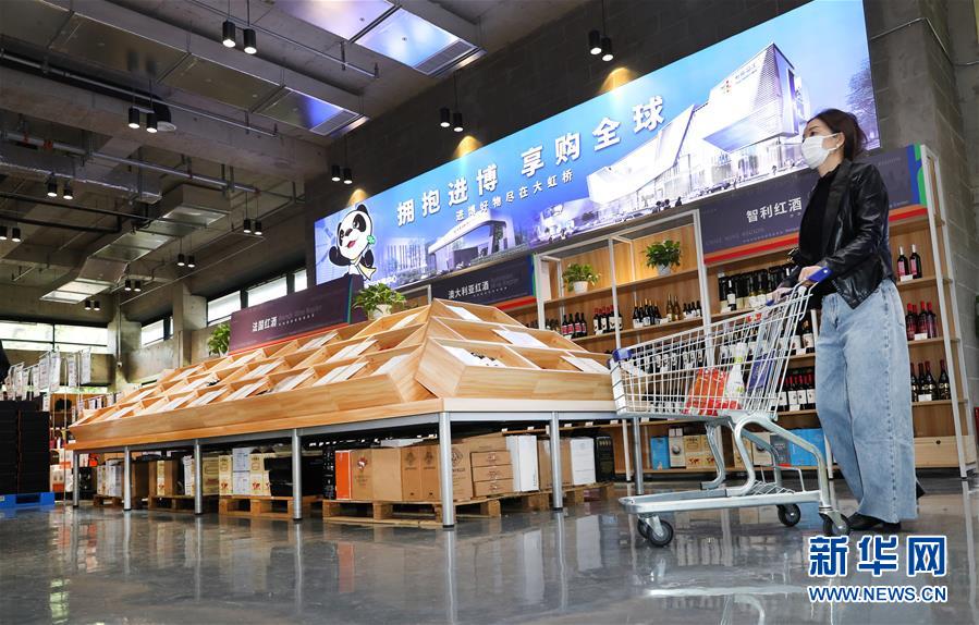 2020年4月25日,“拥抱进博·享购全球”虹桥品汇食品健康馆在上海虹桥进口商品展示交易中心开业,顾客在虹桥品汇食品健康馆购物。新华社记者方喆摄