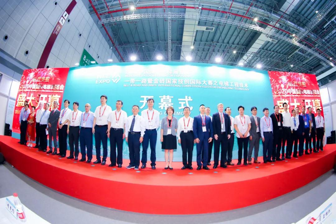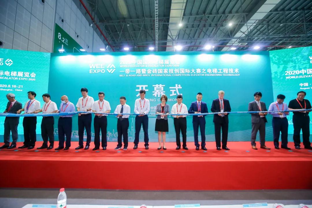开幕式致辞结束后,电梯行业领导和嘉宾为2020中国国际电梯展览会进行剪彩仪式