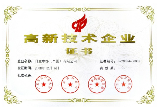 2008年12月,日立电梯(中国)有限公司通过省高新技术企业认定,成为了2008年的第一批高新技术企业。