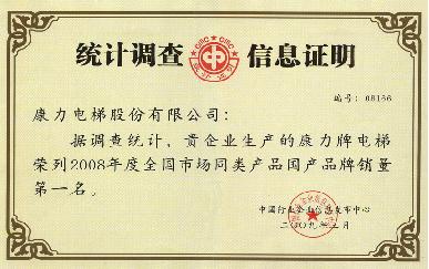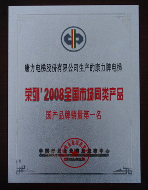 2009年3月,据“中国行业企业信息发布中心”调查统计信息显示,康力电梯股份有限公司生产的康力牌电梯荣列“2008全国市场同类产品国产品牌销量第一名”。自2005年以来,康力电梯已连续四年获得该项殊荣。