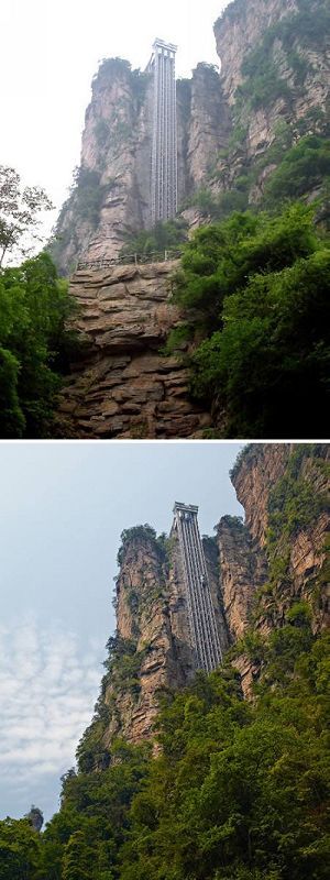 百龙观光电梯位于世界自然遗产张家界武陵源风景区,高326米,采用三台双层观光电梯并列分体运行模式。