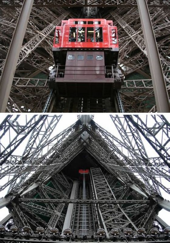 因为埃菲尔铁塔塔基的弯曲结构,当初为它设计电梯被视为极具挑战性的任务。如今的埃菲尔铁塔的每条塔基都有双厢电梯运行,其中还包括塔顶餐厅顾客的专用电梯。