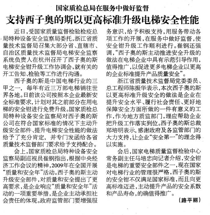 《国家质检总局在服务中做好监督%20支持西子奥的斯以更高标准升级电梯安全性能》信息早报2009年6月8日