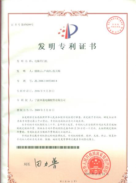 宁波申菱电梯配件有限公司自主研发的交流永磁电梯开门机获得国家发明专利授权。该产品技术方案采用PM电机、双闭环矢量控制、直接拖动和CAN总线通讯技术,实现不同重量和阻力的层门保持开关门舒适性一致的性能,具有技术先进、功效高、能耗低、寿命长、运行舒适、维修方便的特点。2007年通过国家建设部组织的科技成果评估,达到国际先进水平,产品符合国家节能降耗的产业政策导向,突出了产品的绿色环保特征,具有广阔的市场空间和发展前景。