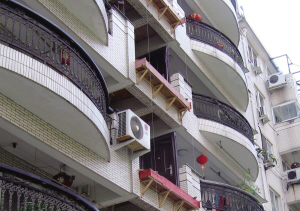 南亚花园A区8幢共5层(不包括地下室和楼顶跃层),每层2户,共10户。7月15日下午,记者在A区8幢北面的施工现场看到,住户阳台之间的间隔处已做了部分改造,看上去是预留了电梯井的位置。每层的外墙上都设置了一个红色的木头架子。除一楼2户和二楼的1户外,其他7户的阳台一侧都安装了一扇铁门(如右图),施工人员说电梯装好后这铁门就是电梯门。8幢北面的绿化带和地面被挖了一个8平方米左右的坑,深约1米,坑内裸露着不少管线,一段水泥排污管已破碎。坑的四周设置了简易护栏,地面上堆着一些材料。