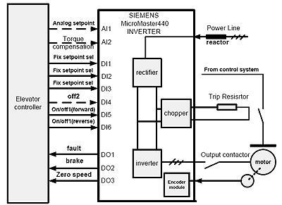 电控系统采用了1 台15kw 电机,1 台15kw MicroMaster440 变频器作为主驱动。变频器使用制动单元和制动电阻释放制动运行时反馈的机械能。系统简单可靠,较传统控制方式大大节省了安装空间,提高了可靠性。电机启动平稳,电流冲击小。机械上冲击亦大为减轻,提高了运行寿命。变频器通过端子控制. 通过数字量输入端子(DIN)给定 ON/OFF1 命令以及固定频率给定。通过3 个继电器输出信号来反馈当前变频器运行状态, 通过编码器模板接收旋转编码器信号。变频器采用闭环矢量控制。