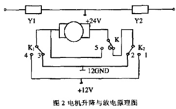 如图2,K1、K2为控制直流电机的两继电器。K2为于1,K1位于3时,电机电流向左;而K2位于2,K1位于4时流过电机的电流向右.电流的反向使电机实现上升、下降。